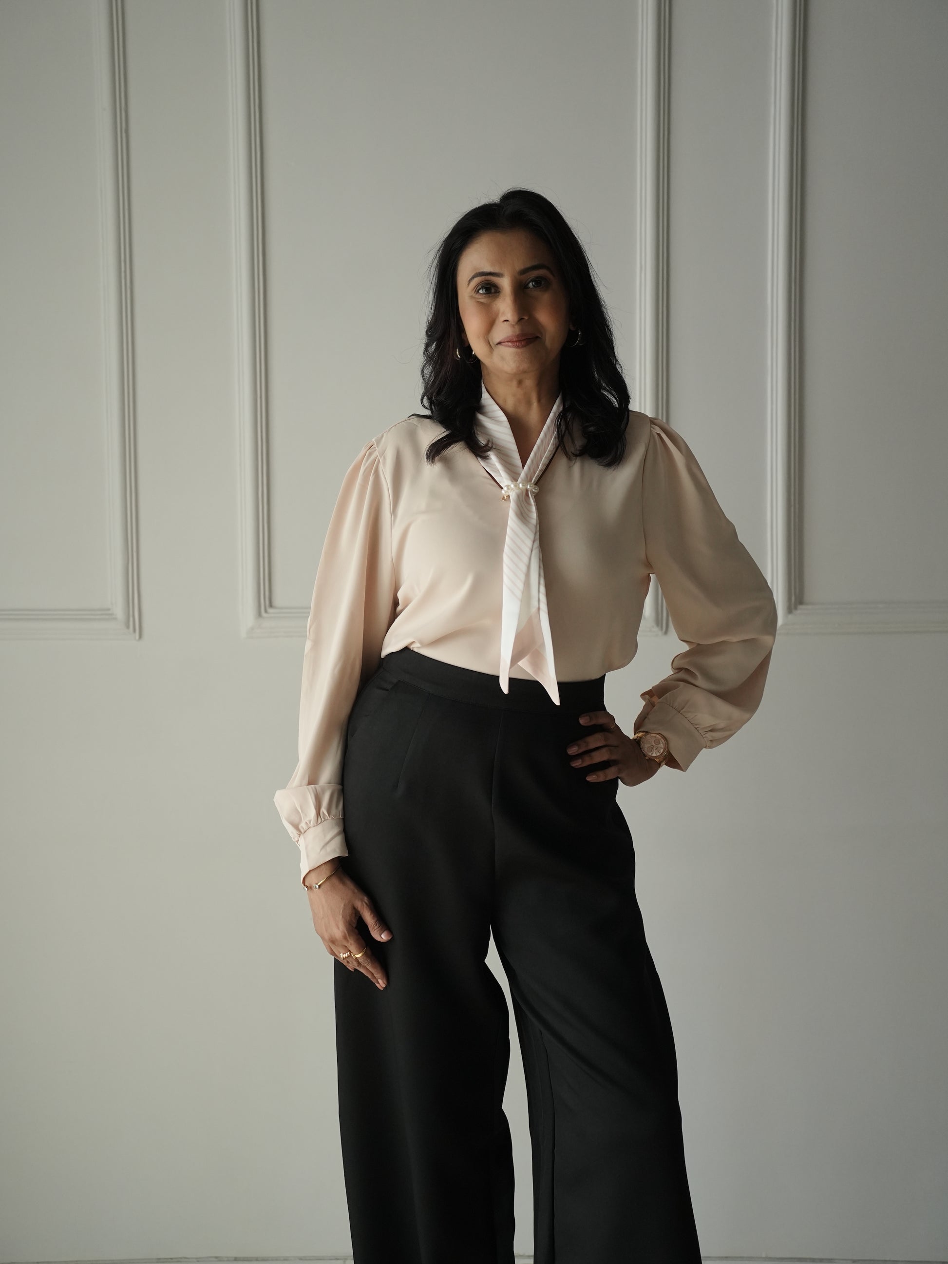 Add a touch of elegance to your outfit with our Beige Scarf Adorn Top! This formal top features a stylish attached scarf and delicate pearl adornments. It's available in one size, fitting comfortably from XS-M. Dress up with ease and sophistication.