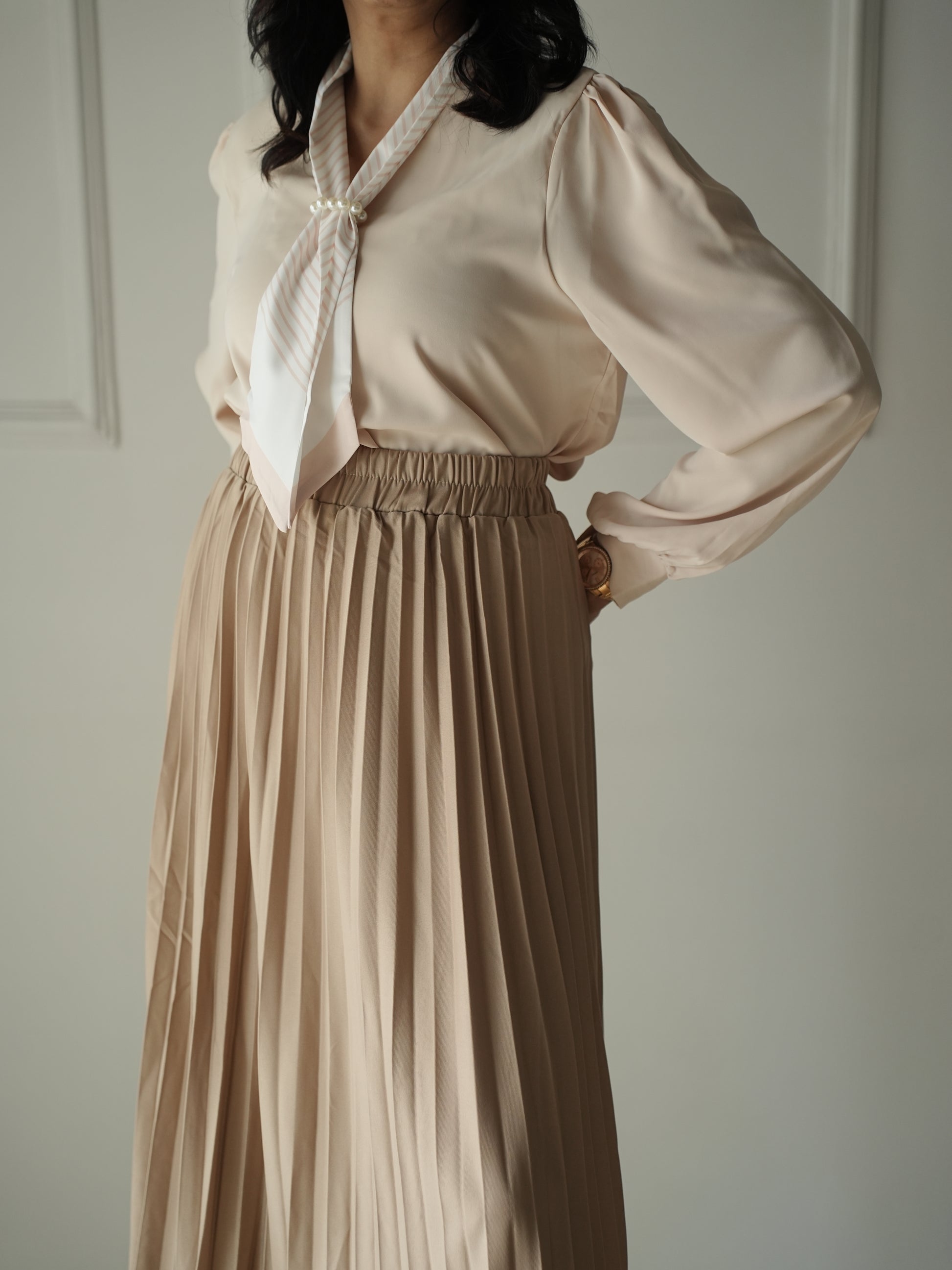 Elevate your everyday style with our Neutral Pleated Skirt. The nude brown color pairs effortlessly with black or other neutrals, making it a versatile addition to your wardrobe. The pleated design adds texture and movement to any outfit. Perfect for staying on-trend while looking polished and put-together.